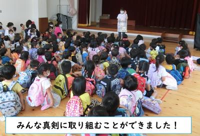 園長先生の放送を聞き、また担任の先生の話もしっかり聞いてホールに避難することができました。
